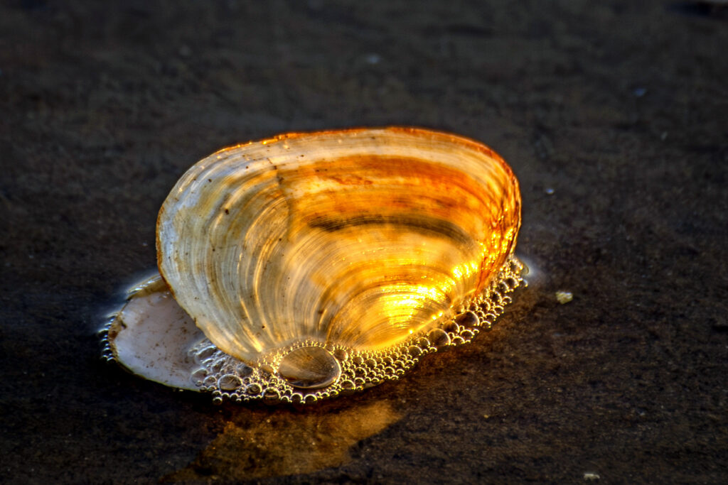 Et teknisk perfekt og næsten magisk billede, hvor lyset fra den nedgående sol, får muslingeskallen til at ligne det pureste guld, som står i skærende kontrast til den mørke ensartede baggrund. – de mange bobler fra bølgeskvulpene, får næsten billedet til at se levende ud…- billedet har en rolig og næsten meditativ stemning, – som man får lyst til at sidde længe og kigge længe på..