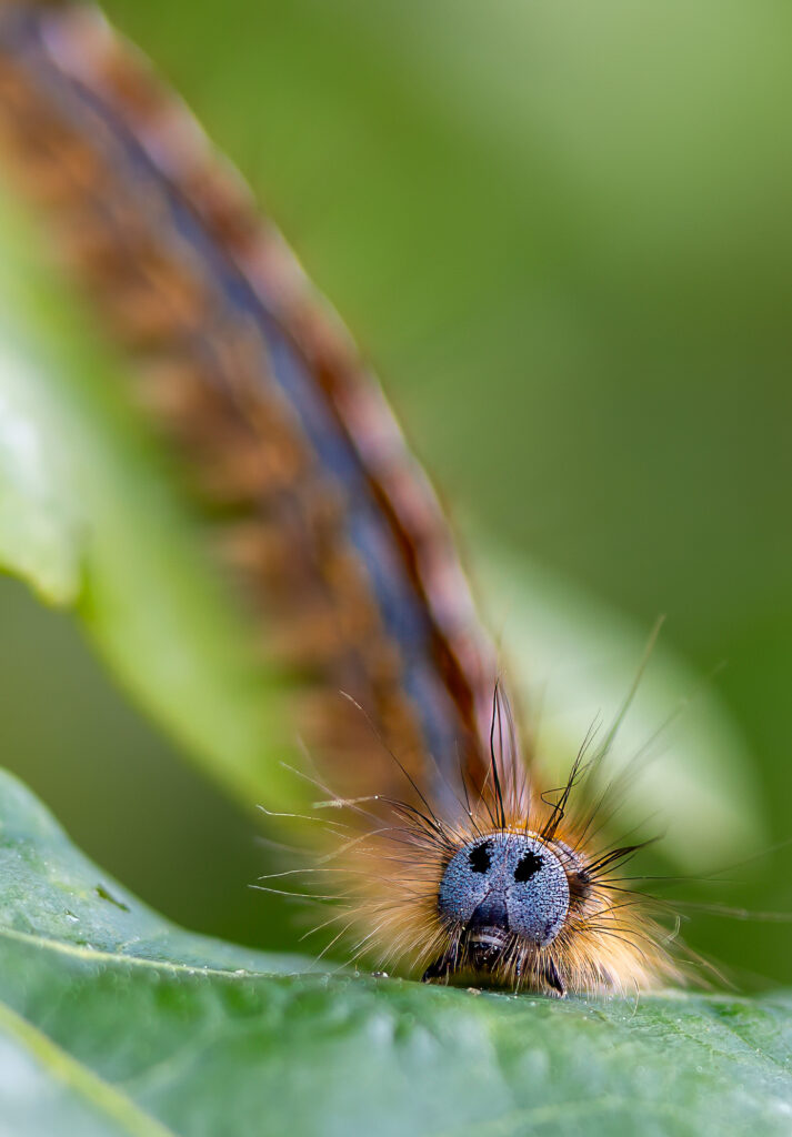 Trods den smalle dybdeskarphed, ligger fokus præcis på ”ansigtet”, selv om larven er i bevægelse. – Og krop og baggrund flyder næsten sammen, så billedet næsten fremstår 3D agtig…..