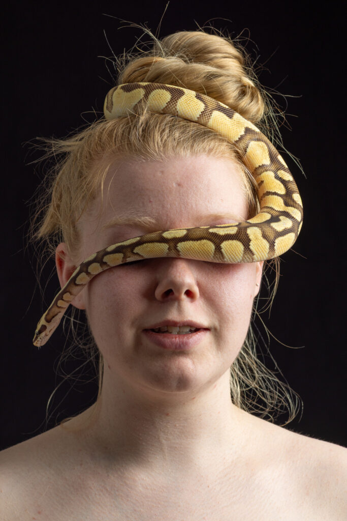 Et teknisk perfekt og modigt portræt, som står fint isoleret fra den mørke baggrund. – Lyssætningen er fin og blød, uden hårde skygger, og pigens hår og hud, står i fin kontrast til slangens stramme linier og skæl. – Og det at slangen dækker pigens øjne, får billedet til at fremstå lidt mystisk, ja næsten mytolgisk.